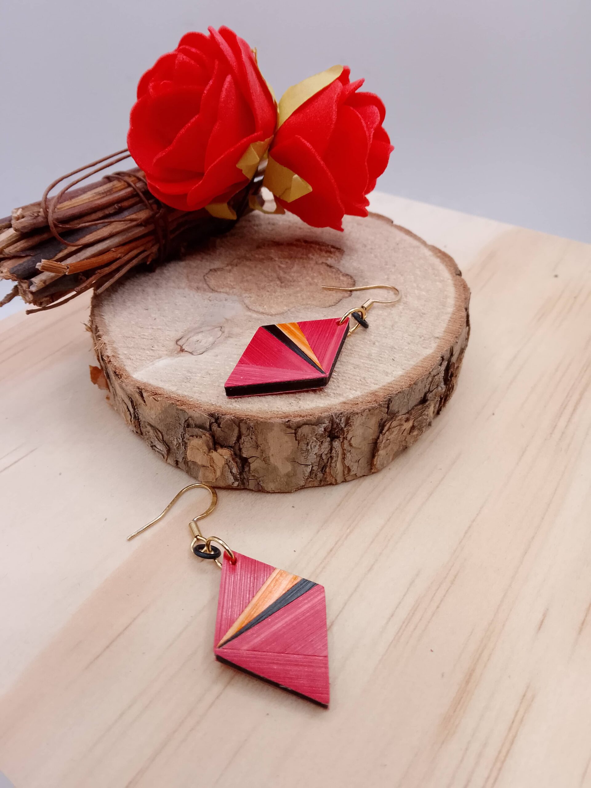 Boucles d’oreilles en marqueterie de paille rouge/orange 3×2 cm.