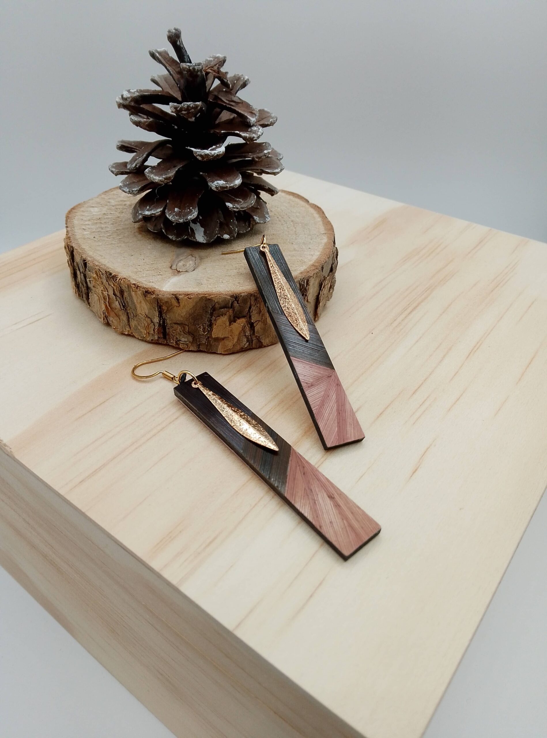 Boucles d’oreilles en marqueterie de paille 6 x 1 cm.